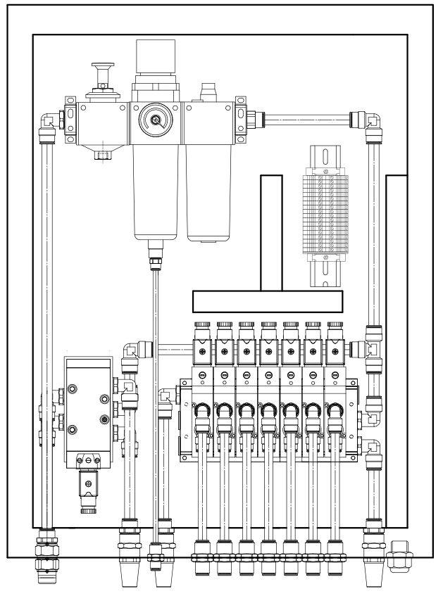 | Электропневматические распределители | смонтированы на групповой монтажной плите, что минимизирует количество пневмолиний. |